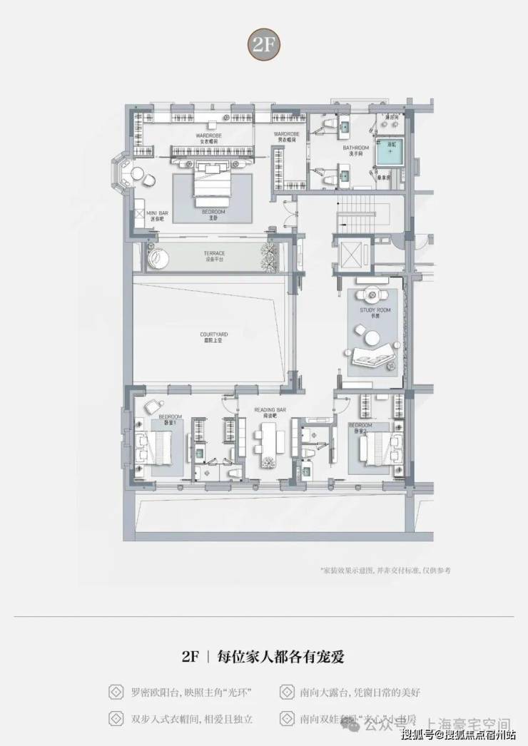 从地下室到顶层,打开生活的垂直剧场,1F庭院与客厅互通,彰显家族生活的轩阔厅堂,2F家庭层,儿女的幸福与陪伴皆在左右,3F总裁套房式Penthouse,用具象的尺度描写人生成就的高度。