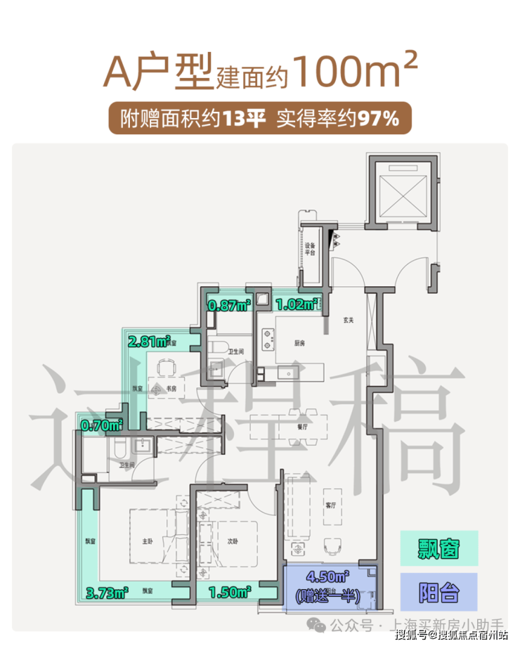 经专业测算, A户型全屋赠送面积高达13㎡,实得率约97% 。