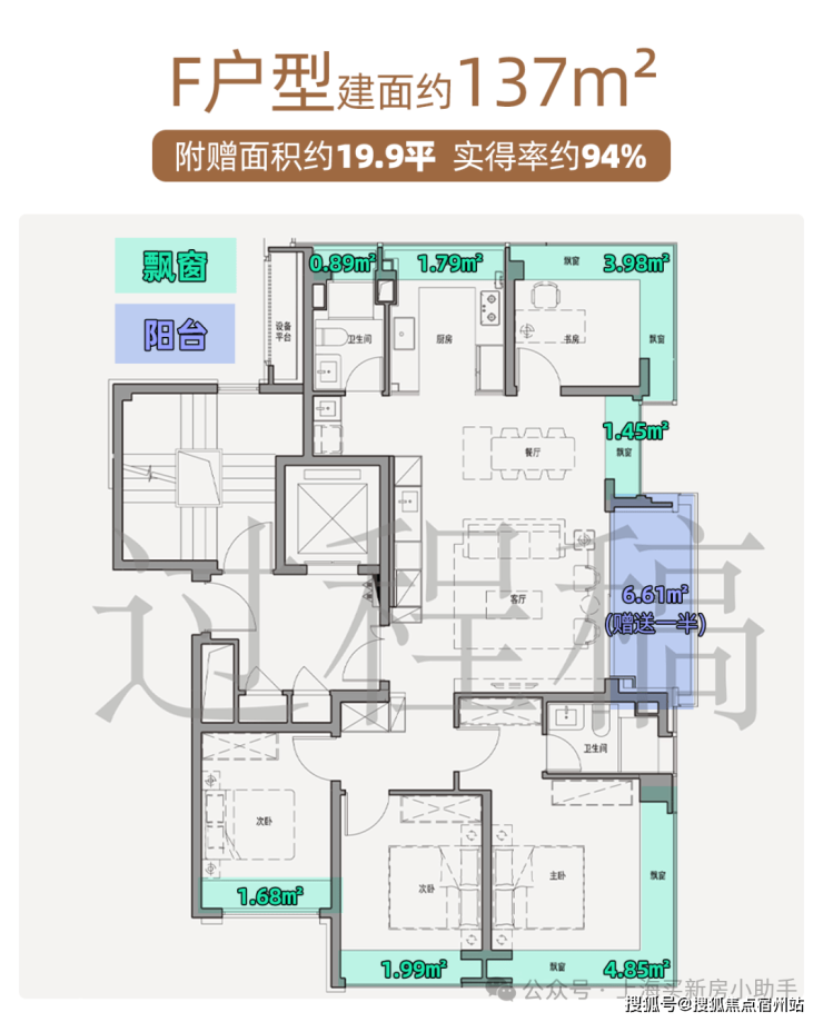 全屋7飘窗+半封阳台,赠送面积近20㎡,实得率约94%。