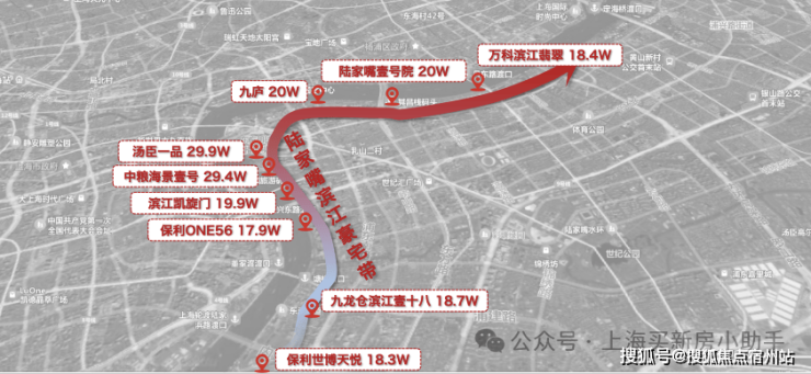 第一代滨江豪宅位于黄浦滨江之上,从中山南路-中山东二路-中山东一路,一众豪宅云集: 外滩源、黄浦湾、新梓园,早已售出20万+,乃至未来预计30w的高价。