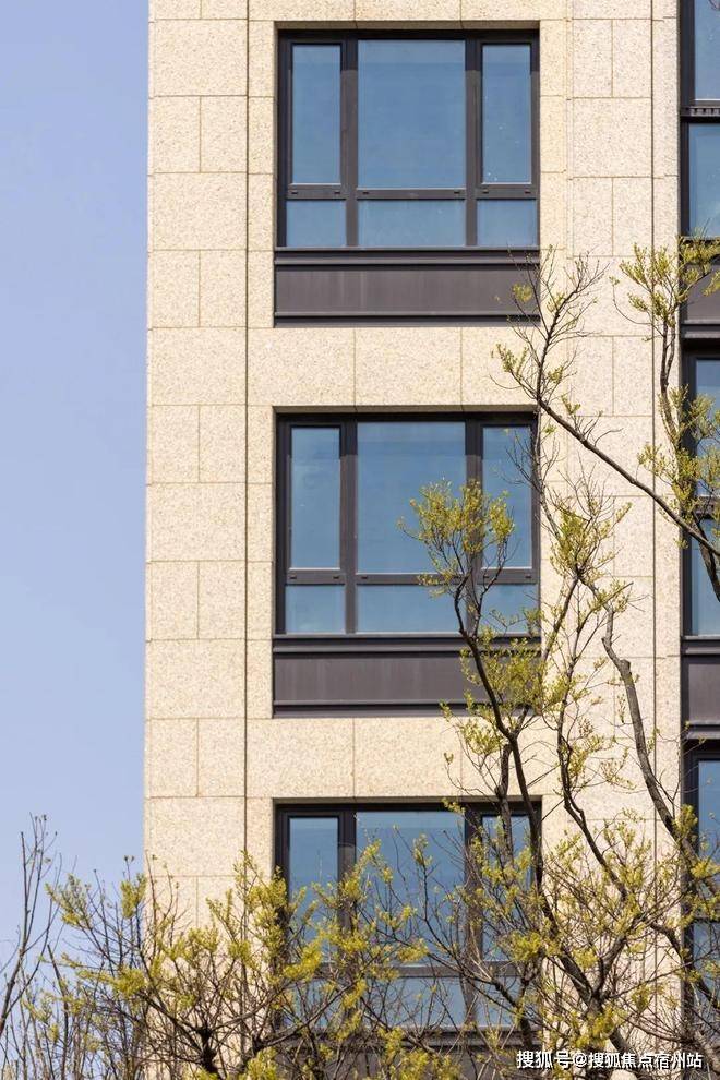 温润淡雅的浅色系全石材干挂外立面,巴西都伯斯金麻、宏宇金麻,搭配铝板线条,以光影雕琢建筑。
