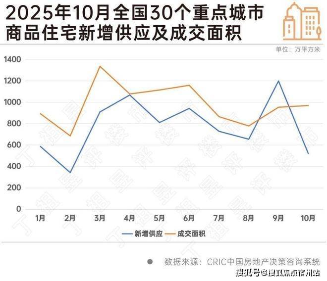从2025年10月的供需情况来看,30个重点城市新增供应522万平方米,绝对量为年内次低,仅略高于2025年2月,包括一线城市和二三线热点城市在内的各个城市供应环比近乎“全线飘绿”。