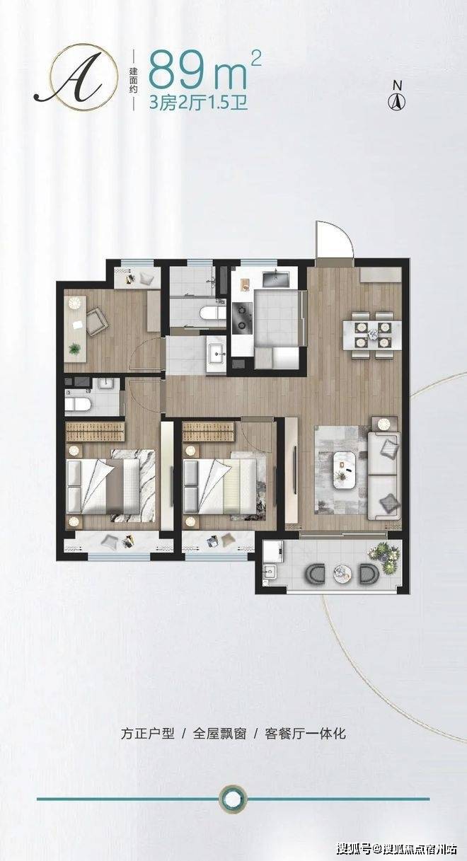 建面约89㎡做3房,功能性上就占尽先机,没想到项目还有1.5卫配置, 主卧升级套房,真正实现一步到位!