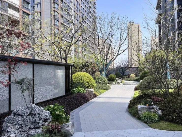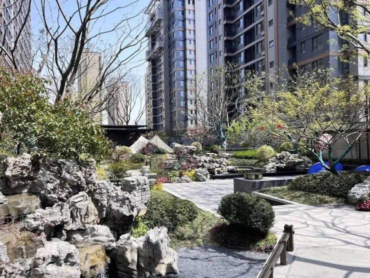 一条清韵石径,挑选造型独特的石头、三两组合成景,搭配特选的造型植物,极具艺术美感。而清泉石流景墙背后,就是未来业主的生活区。