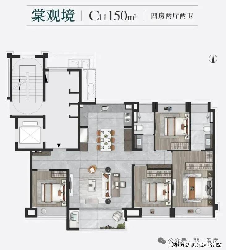 约150㎡4房2卫户型类一梯一户的居住体验,业主能独享一整个电梯厅,加上入户玄关的配置,私密性相当高