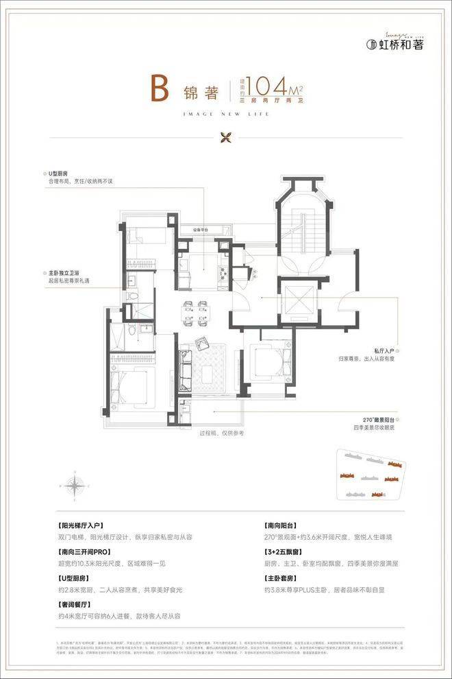 建面约104㎡3房,在建面94㎡小3房优点上,又进一步升级了尺度感, 约10.3m的南向面宽,为室内带来了出众的采光面和尺度感,这个户型无论从实用性、尺度感,亦或是视野、采光、私密性来说,都做得相当优秀。