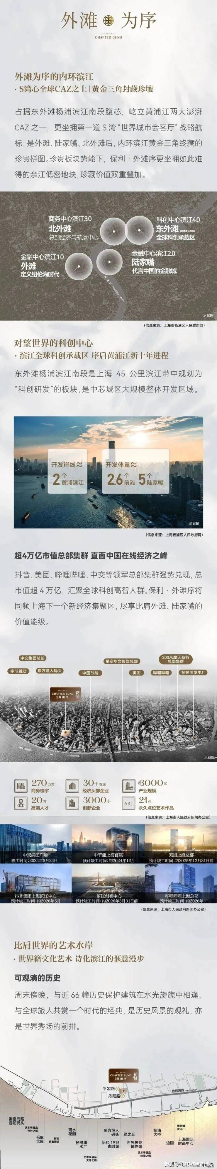 并且,东外滩杨滨的规划不只是“纸上谈兵”,它的兑现更是与日俱新的“快”。预计2026年,美团、B站、抖音等众多总部将投用。规划的270万方商办体量,将聚集30+在线经济头部企业、3000+创新型企业,企业总市值超4万亿,吸引超30万创新创业人才,世界总部集群正加速兑现。未来高端人才汇入后,将释放强劲高端配套与居住需求,城市资源与土地价值将由此迎来巨大攀升,滨江开发的全新按钮由此启动。(数据来源:上海市人民政府新闻办公室)