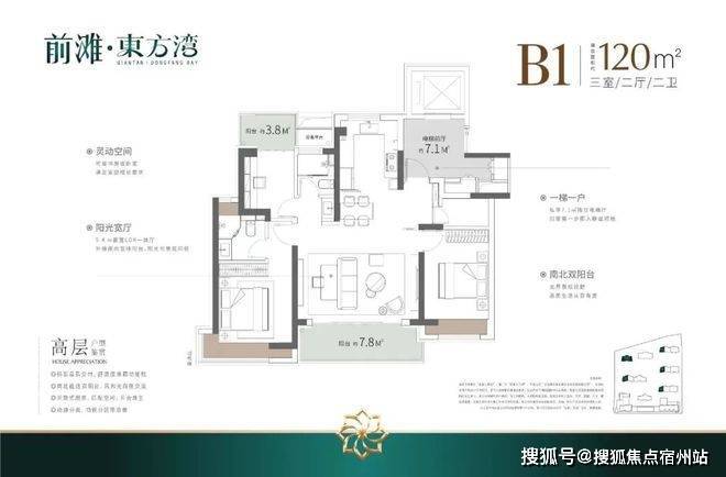建面约120㎡3房2厅2卫,做到了3开间朝南+双阳台+主卧套房设计+270°转角飘窗,居住体验、舒适度、尺度感倍增。