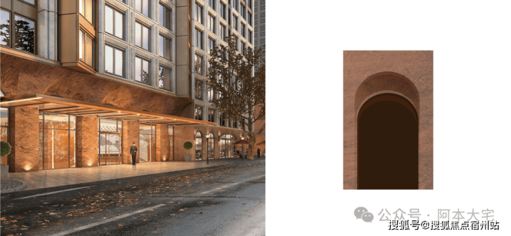 在高层的底层商业部分,项目选用了来自巴西的奢石波多尔红,搭配高难度的双曲面工艺,呈现出独特的优雅与魅力。商业以上的建筑立面,用巴西进口玫瑰金麻造型石材搭配局部铝板及金属线条,强化了现代感,传递出新旧交融的气质。