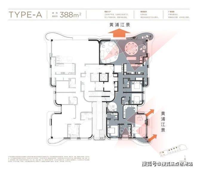 建面约388㎡户型,位于滨江首排、江景0遮挡。
