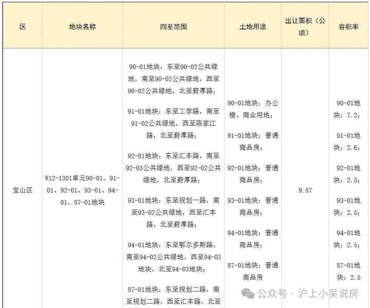 前不久,宝山区W12-1301单元90-01、91-01、92-01、93-01、94-01、87-01地块正式出让。