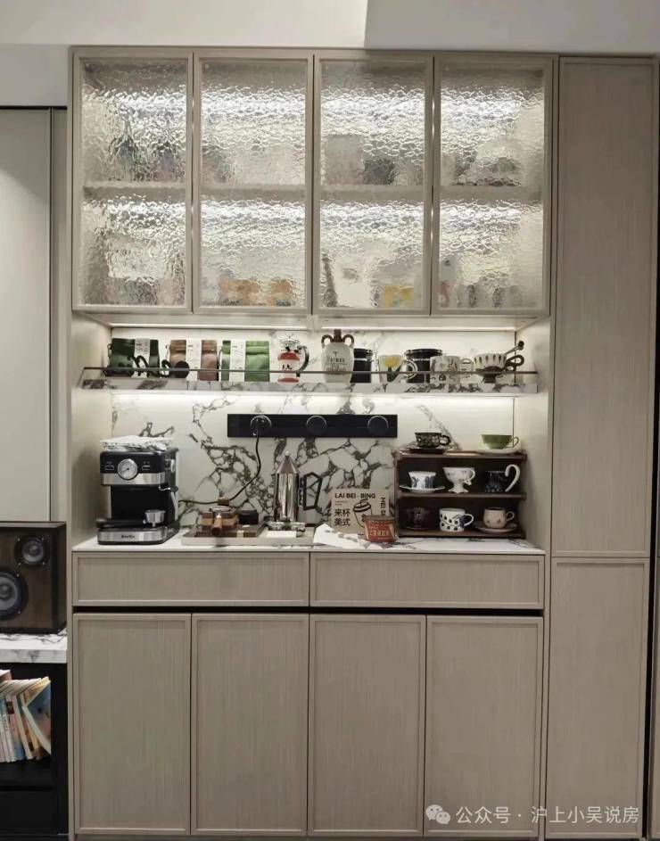 大量的隐藏收纳柜,让业主随心所欲的大量囤货、购买心仪之物,并且能保证居住空间的整洁、舒适。 本次还增加了非常实用的零食柜和餐边柜, 未来业主在这里可以作为自己的一个日咖夜酒区域。