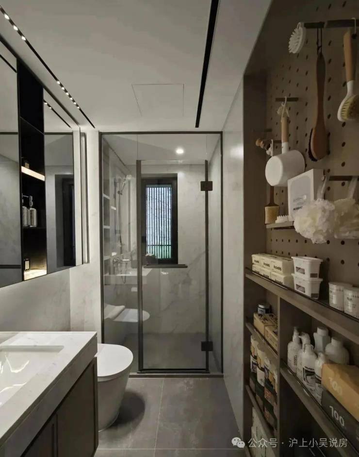 另外,在卫生间部分,项目在台盆对面做了一个墙体的向后延伸,再次做出一个超大尺寸的洞洞墙板和储物柜,原本只有镜柜的收纳空间瞬间就扩大了不止一倍。