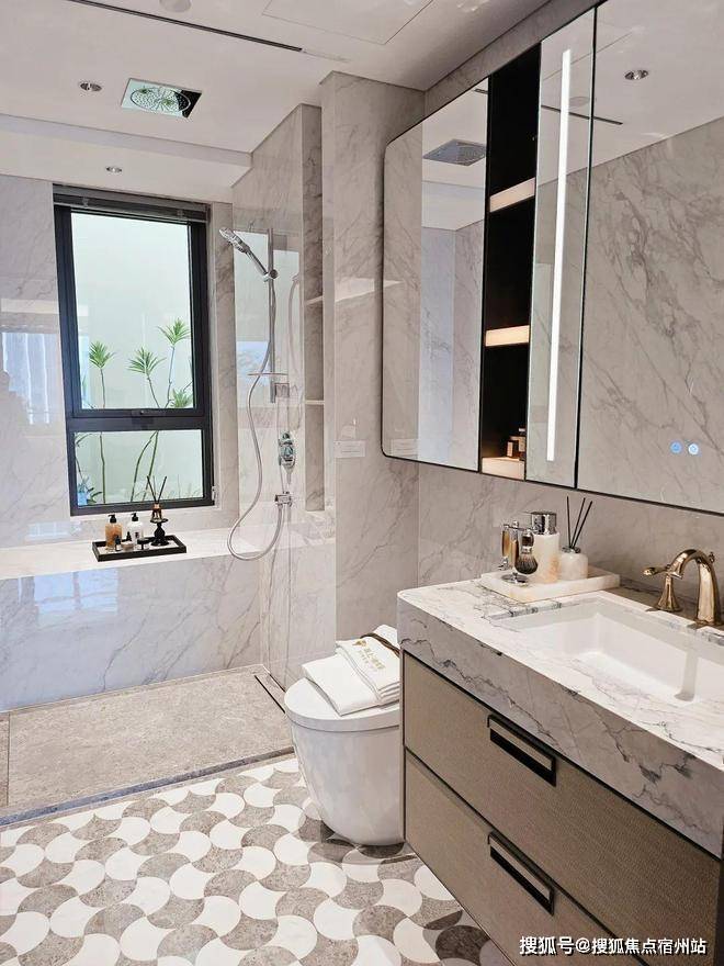 奢石台面,皮革饰面柜抽屉,侧端设置金属收纳开放格;海上清和玺售楼处电话☎:400-8266-670✅✅定制镜柜,中间的透光玉石直接提升了高级感,镜柜内部配备了美妆冰箱+美妆灯条+轨道收纳!海上清和玺售楼处电话☎:400-8266-670✅✅