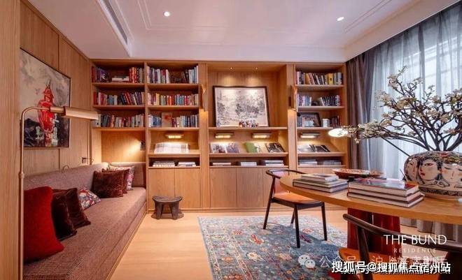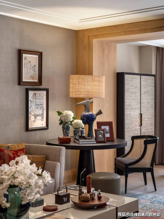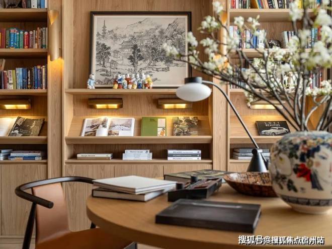 多功能书架彰显着设计的巧思,形成有如博物馆般的展示方式天潼198售楼处电话:400-8266-670☎️☎️✅✅,即可放置日常读物,亦可展示珍本藏书。同时,利用屏风做隔断,天潼198售楼处电话:400-8266-670☎️☎️✅✅与圆桌结合形成私密空间。
