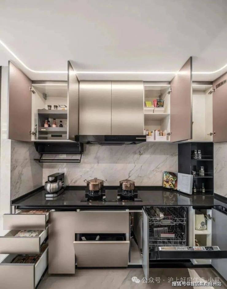 厨房的收纳空间几乎能填满整个厨房空间,这些收纳空间不是随意塞满的,而是根据日常烹饪习惯的频率来贴心规划。