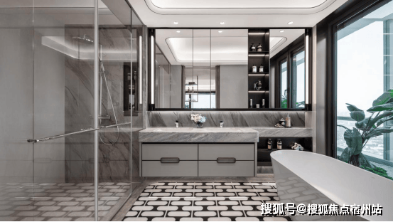 主卫镜柜收纳空间,满满的一面墙,还贴心配置了一个可调节温度的美妆冰箱 ,女主人看到了很难不心动!