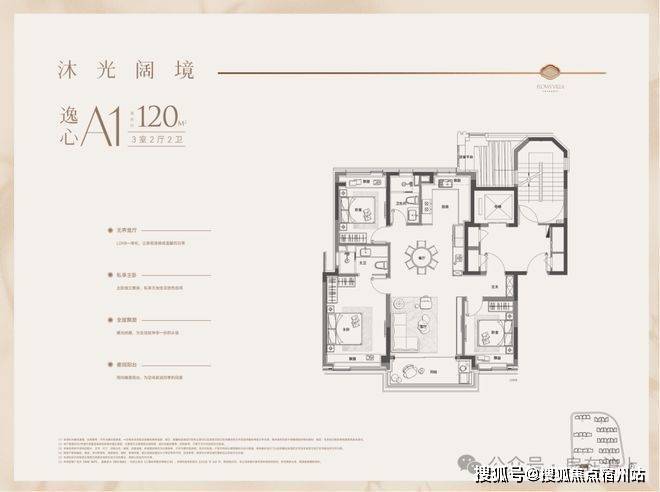 绿城逸庐售楼处电话400-856-9058户型特点:边套户型,3开间朝南,方正格局。客餐厅一体化设计,餐厅空间宽敞,客厅进深较短但可通过与阳台连通优化空间感。全屋飘窗设计,边套南北卧室为270°转角飘窗,采光充足。独立电梯厅约7-8㎡,可改造为玄关或收纳空间。