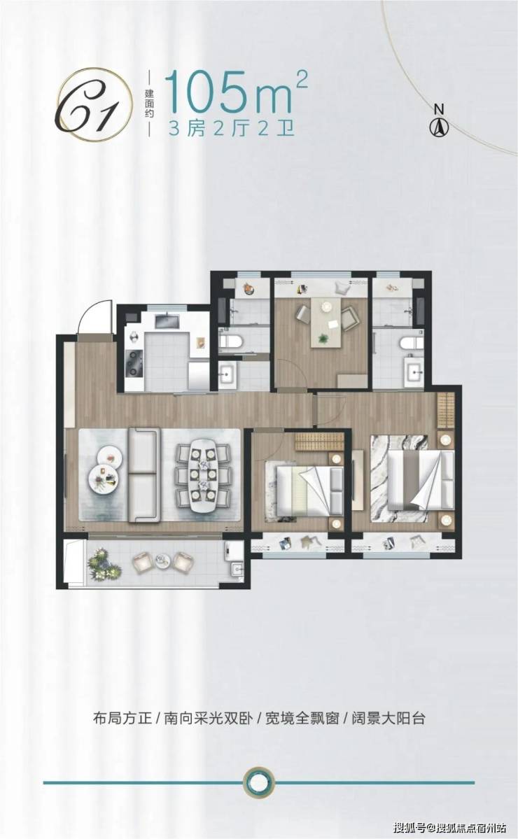 建面约105㎡3房,餐客大横厅设计,与南面阔景阳台相连,采光通风良好。全卧飘窗,主卧套房设计,提升了居住舒适度。U型厨房,动线流畅。