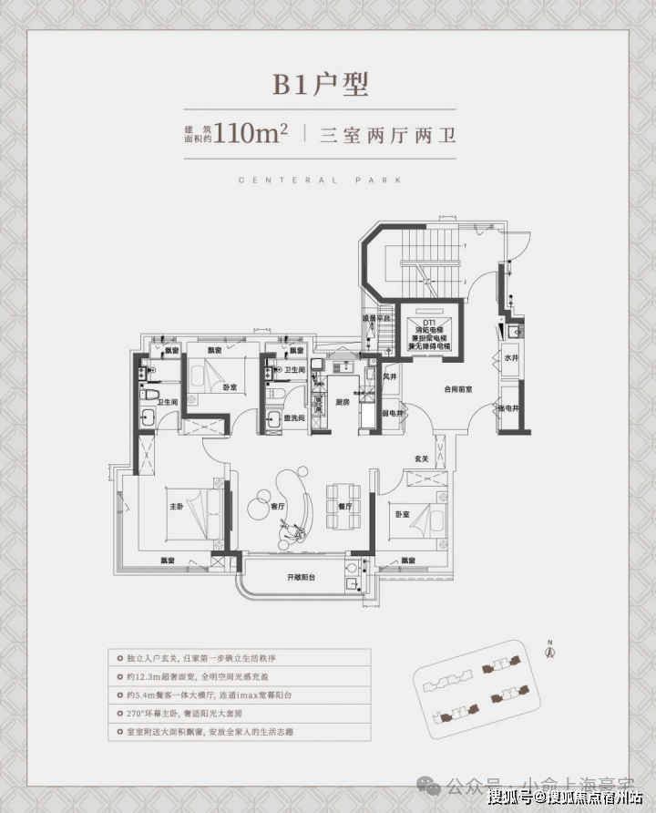 建面约110㎡三房边套户型,约5.4m超大横厅、南向面宽做到了惊人的约12.3米,堪比别墅级别的产品! 巨幕阳台+边套270°景观视野, 空间体验与采光感拉满!