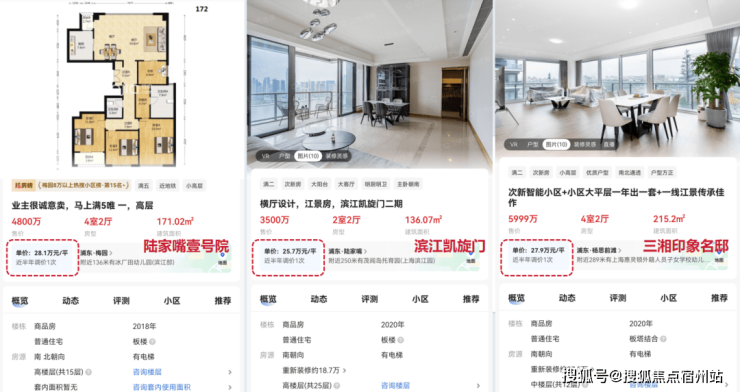 又比如二手房市场,浦东滨江豪宅中高区瞰江房源挂牌价普遍高达23-28万/㎡