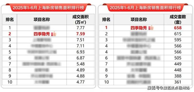 从2025年1-6月上海销售情况来看, 四季隐秀成交套数名列第一,成交面积位列第二。