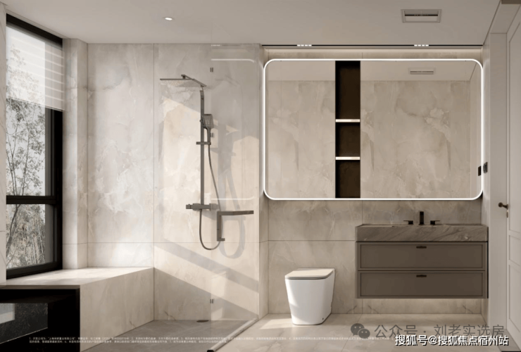配备美妆龙头,大容量镜柜可收纳洗漱用品,利用墙面空间设置壁龛,便于存放毛巾、衣物便于取用。