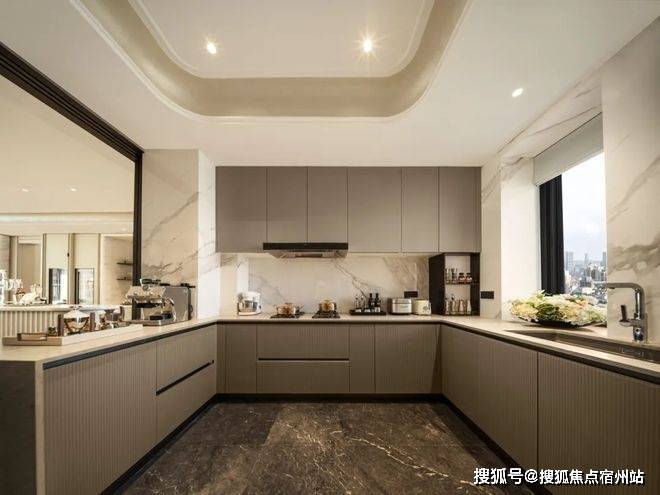 客厅区域,采用270°环幕视野设计,超大采光面,将瑞虹板块的城市景观与社区园林景观尽收眼底,中高楼层更能远眺北外滩与陆家嘴天际线,视野开阔,采光充足。客厅阔绰宽敞,可容纳家族宴请、高端社交等多种场景,搭配开放式西厨设计,既增强了空间的通透感,又满足了高净值人群的烹饪与社交需求,让家人与朋友在轻松愉悦的氛围中交流互动。