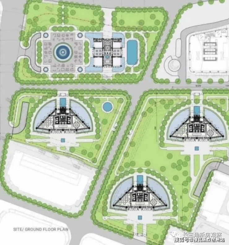从建筑的外部来看,整个建筑在设计上采用了底层超高架空,第①层的大堂被水系景观包围。