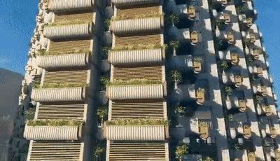 塔楼立面分为上、中、下三段,设计了充分的空中绿化 ,充满未来主义的立面中透出Artdeco风格,与上海这座远东都市形象相契合。