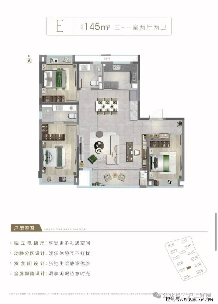 做到了3+1开间朝南+双套房设计+卫生间干湿分离,是“一步到位”的进阶改善4房!