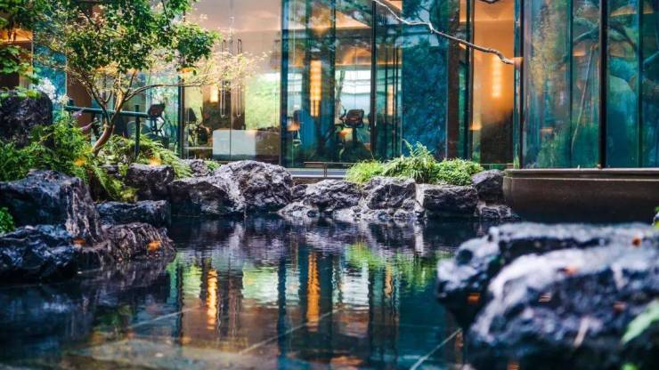 街角花园,用丛生的乌桕、冬青等,构筑社区外的口袋花园,消弭了社区与外部的边界感。摩登水院,华灯映入水池,雍容华贵。