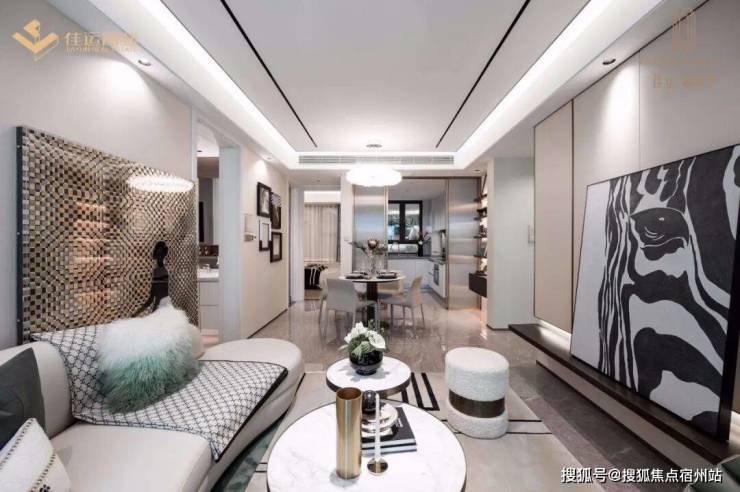客厅和主卧都标配悬浮吊顶、无主灯设计,背景墙采用皮革和铝合金拼接,也都是实体交付的。