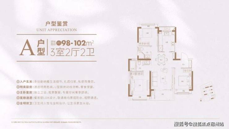 那得益于高得房率,建面约98-102㎡3房2卫餐厅位置都能放下圆桌,客厅面宽也比一般百平米户型强,重要的是三个房间舒适度均衡,不大可能出现两大一小很影响功能性、体验感的现象。