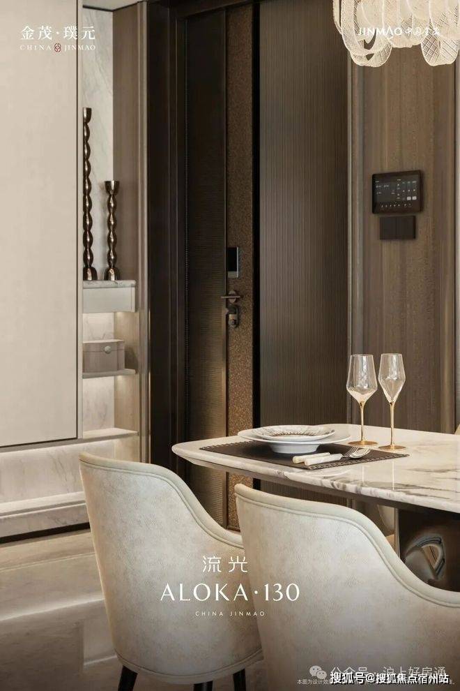 餐厅区域打造了整面墙的餐边柜(交付标准),✅✅金茂璞元售楼处电话:400 - 8824 - 258✅✅中间是弧形的芬迪白奢石背景墙,工艺复杂,视觉效果非常震撼