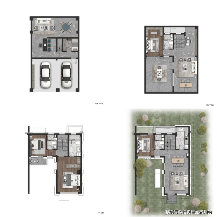 约95㎡合院产品做到了 地上2层 , 地下室挑高 5.5米。