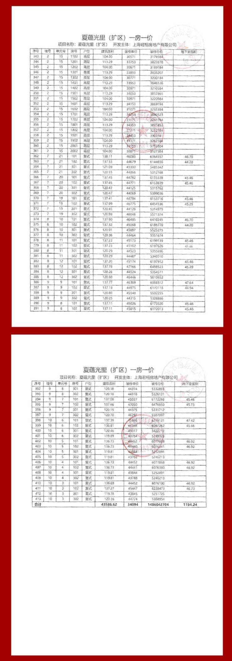 项目一房一价表