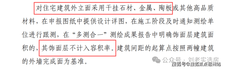 新规规定如果外立面采用干挂石材、金属等高品质材料,饰面层不计入容积率。