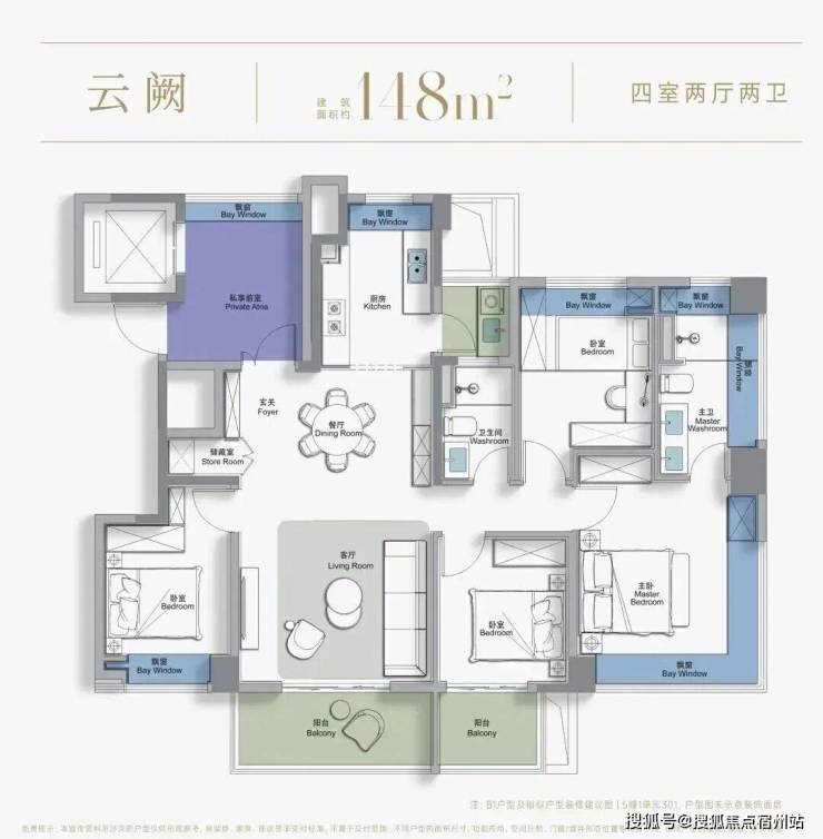 尤其是北次卧, 面积约9㎡,几乎对标同类竞品的主卧大小了,结合北向景观飘窗,视觉上增加室内通透度,提升空间利用率。