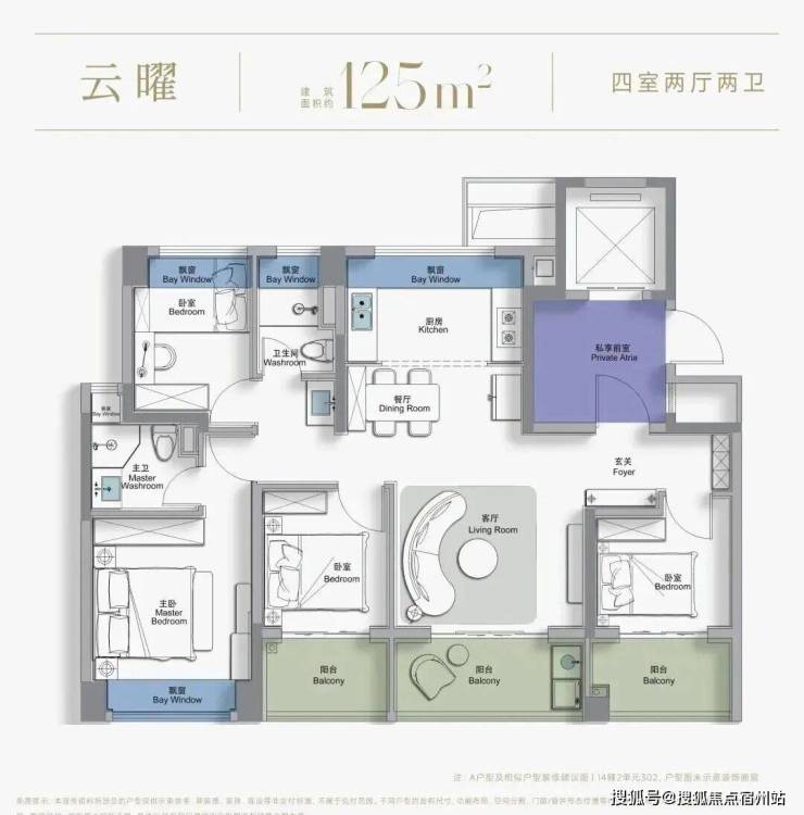尺度感上: 这是新政后松江板块首个 四开间朝南、且不封阳台的三阳台 户型。