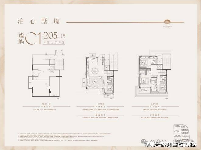 户型特点:下叠边套,南向面宽约9米,客餐厅同宽约5.8米,空间开阔。一楼设南向卧室,采光好且视野佳。二楼为三套房+主卧总统套房设计,主卫南向,可容纳浴缸和双台盆。地下室方正,附赠采光井,利用率高。