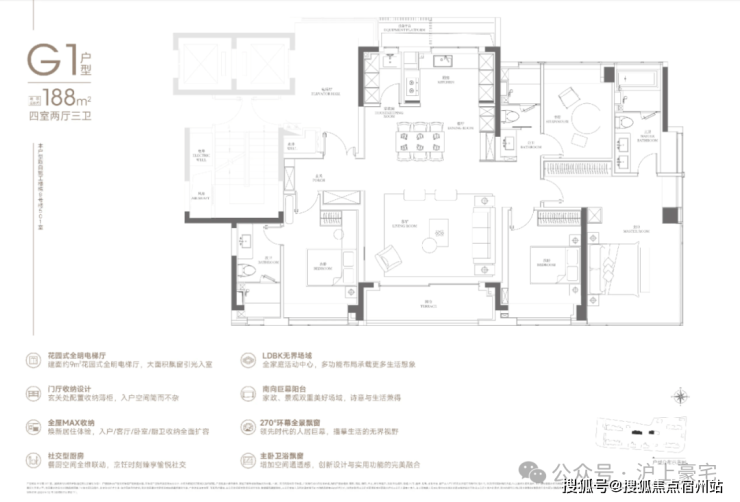 188户型2梯2户,有独立的电梯厅。4房3卫设计,还是3明卫,这两点还是不错的。