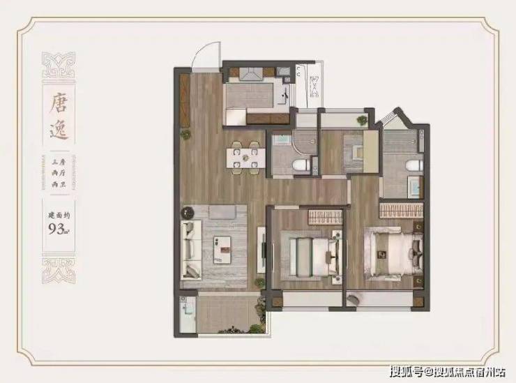 约93㎡的户型,3房2卫的格局,比市面常见的户型多了1卫,可避免早高峰抢厕所的尴尬。