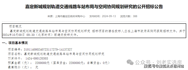 去年9月13日,上海政府采购网发布《嘉定新城规划轨道交通线路车站布局与空间协同规划研究的公开招标公告》。
