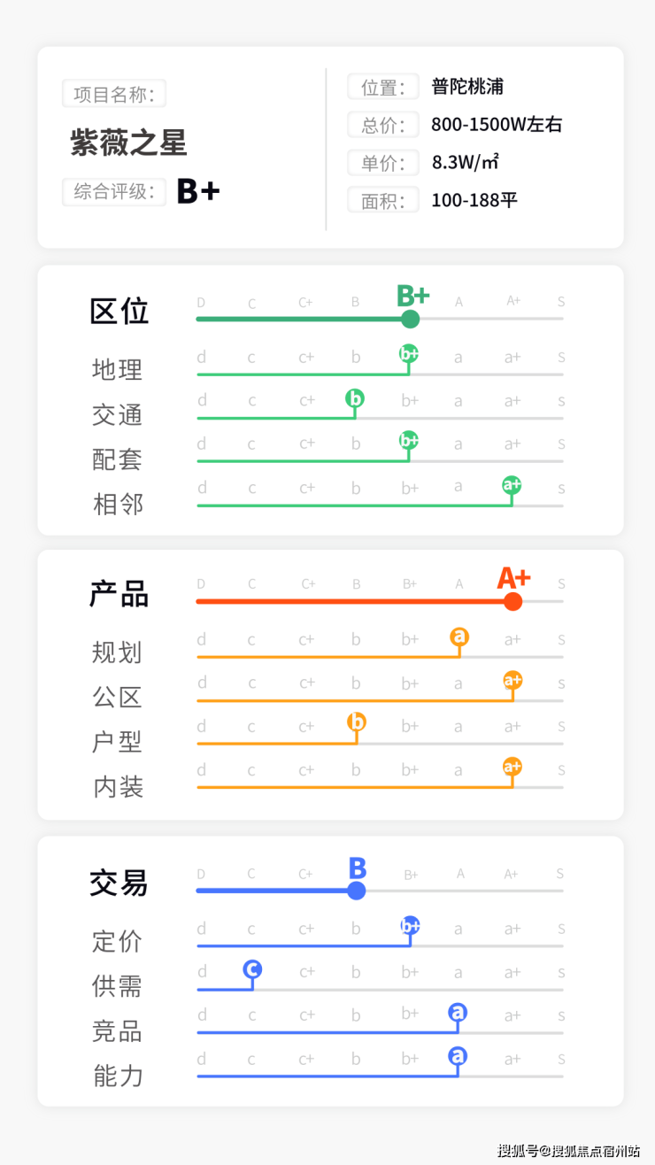 产品评级B,其中,规划与排布b,公区b,户型c+,内装a。