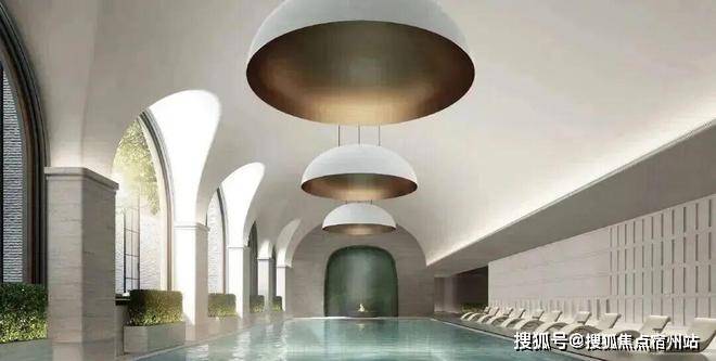整个泳池天花板,呈现出海派拱形元素,落地玻璃窗外,是下沉式的景观空间: