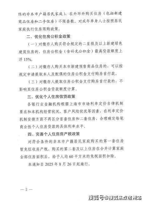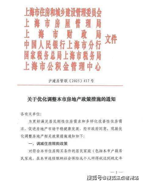 为更好满足居民刚性住房需求和多样化改善性住房需求,促进房地产市场平稳健康发展,8月25日,市住房城乡建设管理委、市房屋管理局、市财政局、市税务局、人民银行上海市分行、市公积金管理中心等六部门联合印发《关于优化调整本市房地产政策措施的通知》(以下简称《通知》),包括调减住房限购、优化住房公积金、优化个人住房信贷以及完善个人住房房产税等政策。《通知》自2025年8月26日起施行。