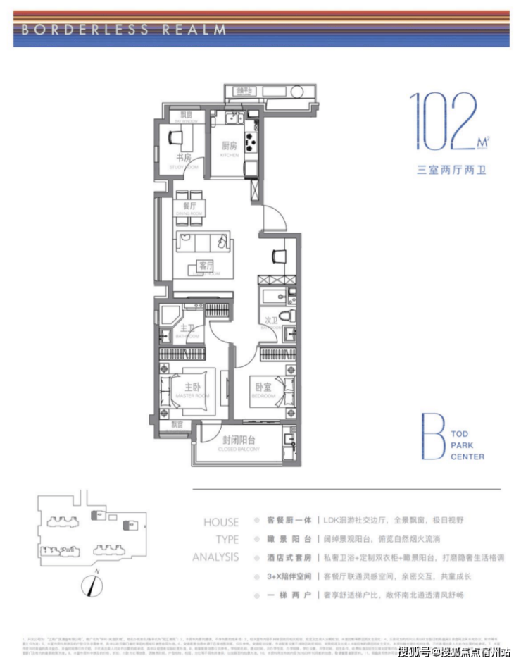 建面约102m²户型特点:LDK洄游式景观边厅,景致拉满,3+X陪伴空间,承载更多自定义功能需求,开放式厨房,烹饪与客餐厅无界互动。
