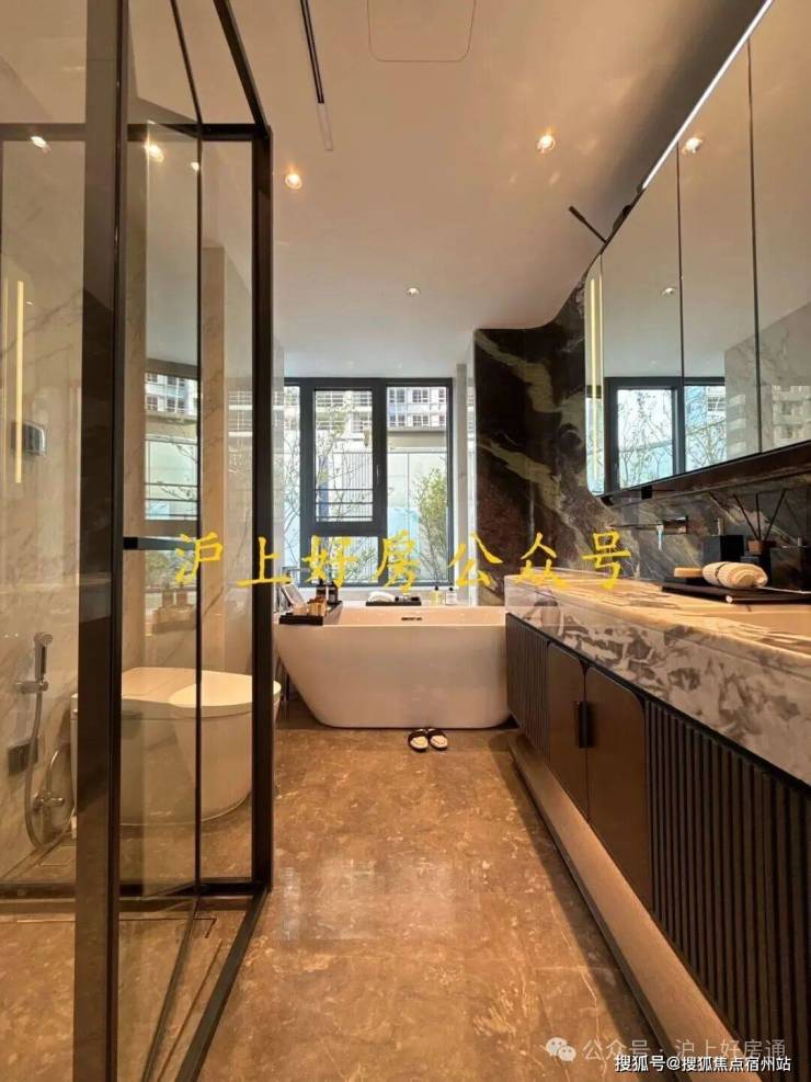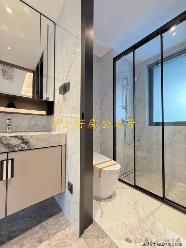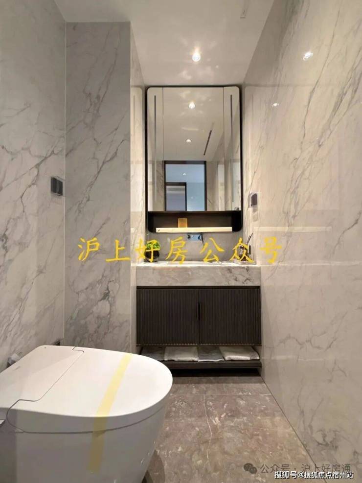 奢石台面,皮革饰面柜抽屉,侧端设置金属收纳开放格;定制镜柜,中间的透光玉石直接提升了高级感,镜柜内部配备了美妆冰箱+美妆灯条+轨道收纳!