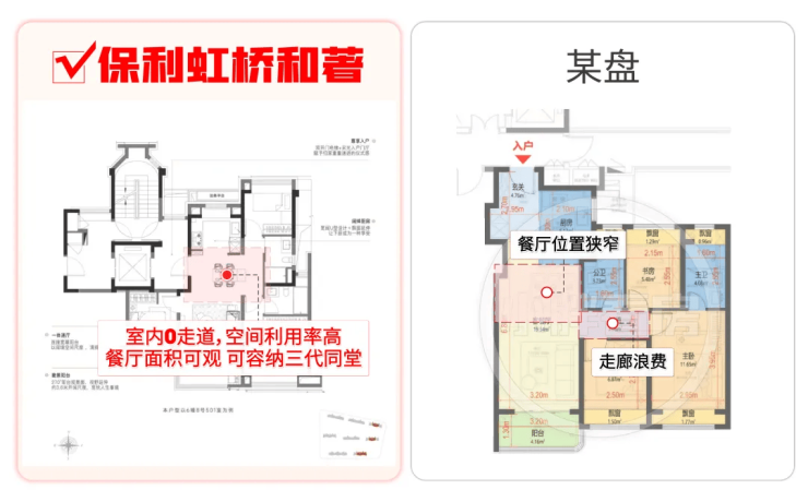 先说户型:如果你熟悉上海市场,你会发现目前市面上的户型普遍会面临:利用率低、收纳空间少、有连廊、卫生间少/功能性差、卧室太小不够等问题。但保利虹桥和著的建面约104㎡3房2卫,却很好的解决了以上所有问题: